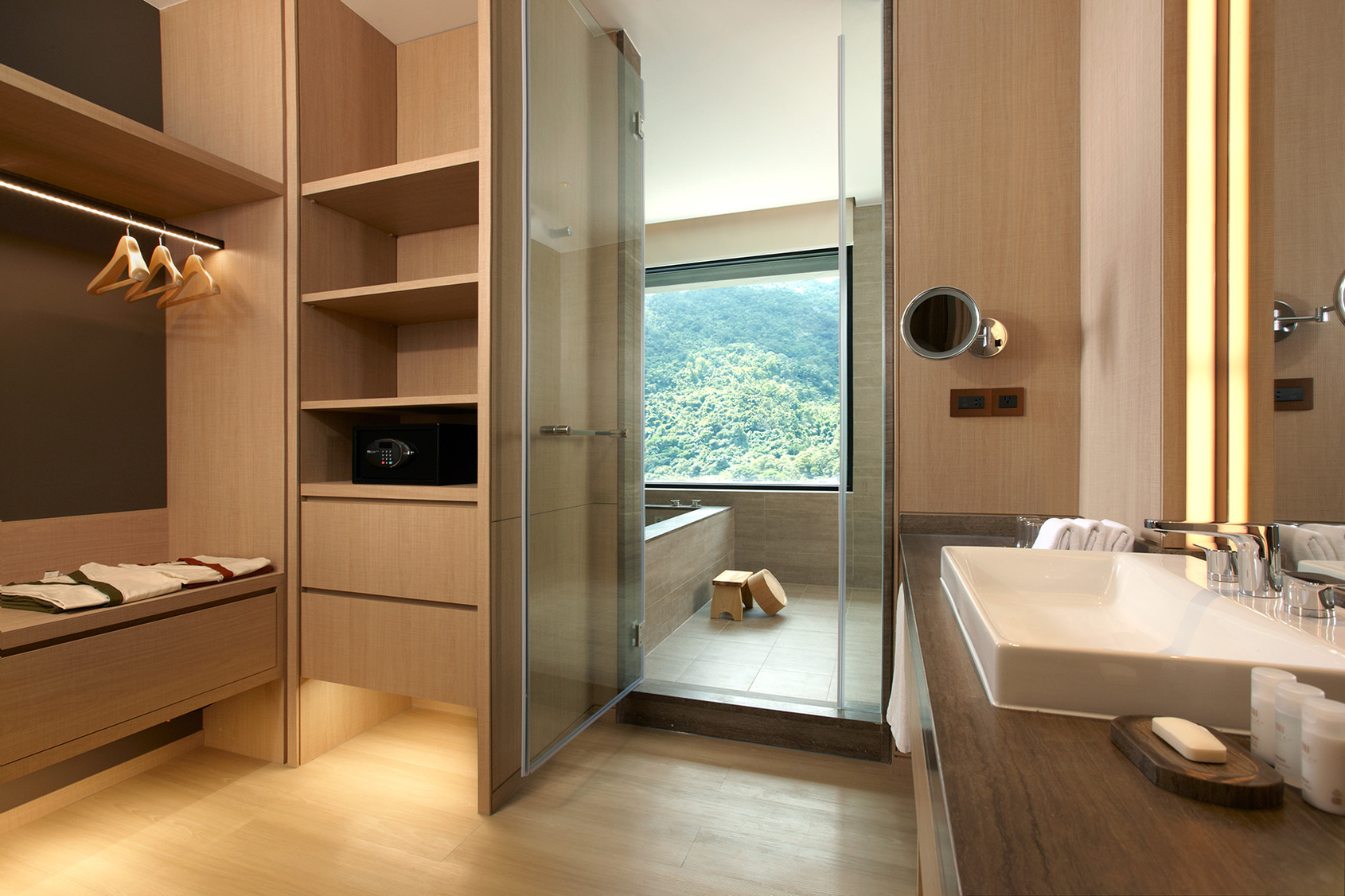 和煦陽光灑落在簡約靜謐的環境中,光影共舞讓人感受幸福的溫度,享受泡湯樂趣時,窗外雲日相輝映的美景映入眼簾,