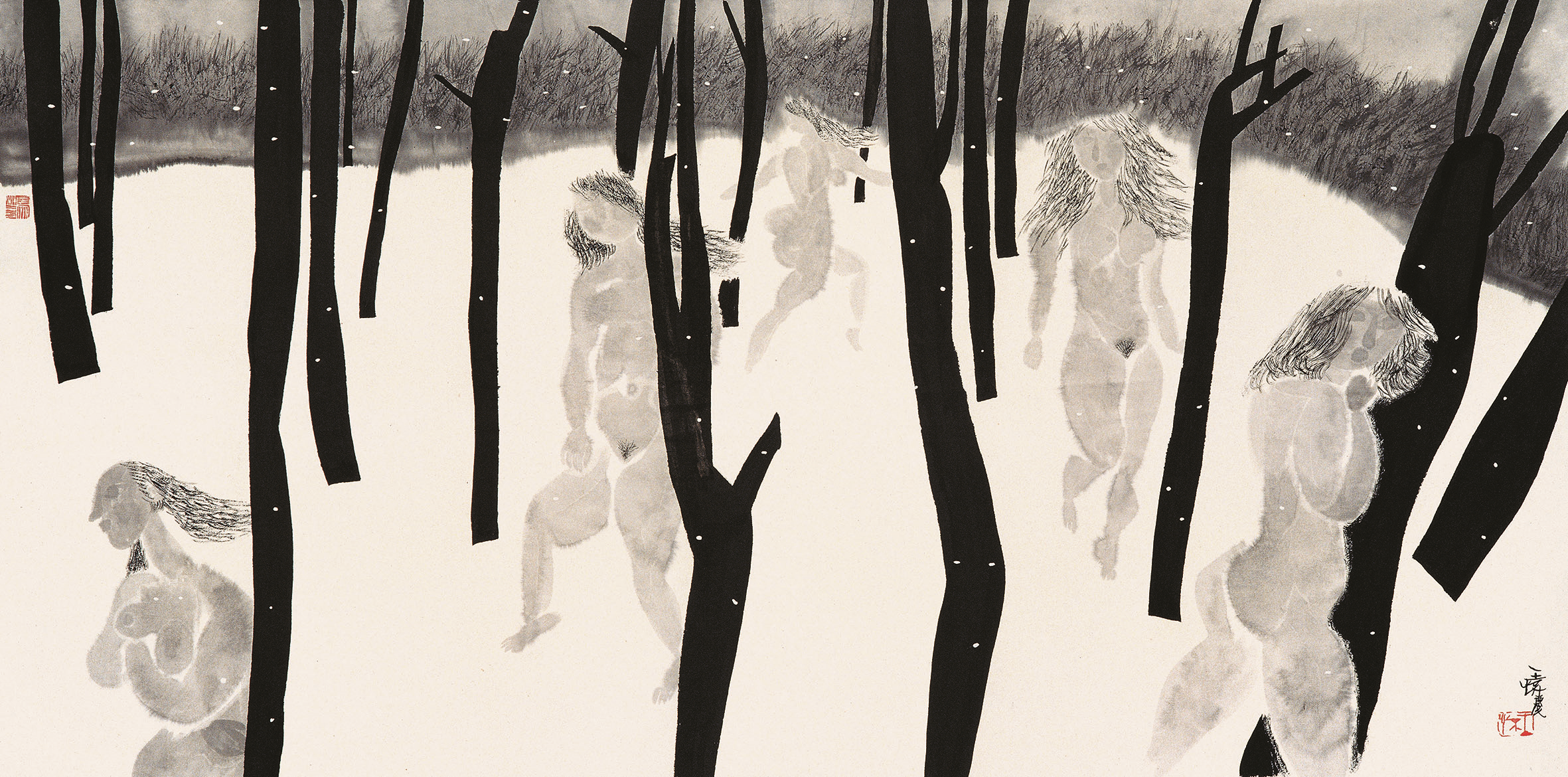 왕화이칭은 서양의 방식과 중국 전통을 결합시켜 작품 속에 깊이 녹여냅니다. 《서설》은 한정판 실크 스크린 판화 작품으로 수묵만의 독특한 번짐 효과를 통해 다양한 여인의 자태를 표현해 내고 있습니다. 그 분위기가 매우 독특하고 형태가 평온하면서도 우아할 뿐만 아니라 내제된 힘과 시적 의미를 확인할 수 있는 작품입니다.