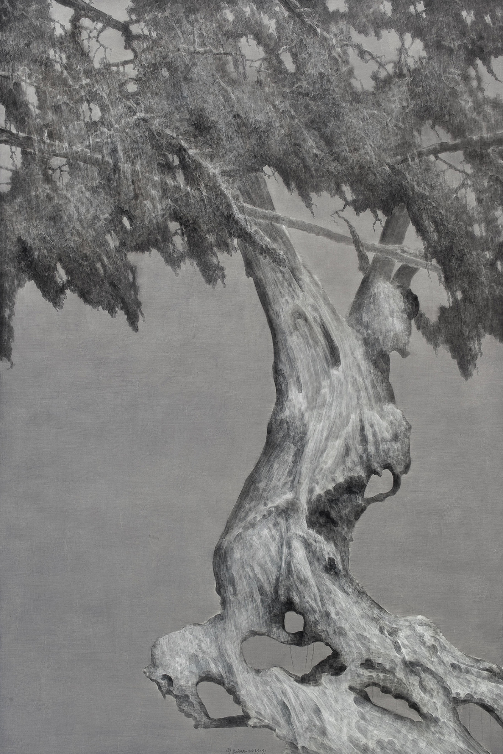 쉬에송은 자연 산수의 소재를 매우 즐겨 활용합니다. 만물 사이의 연계에 대한 탐구를 통해 내재된 문화 정신과 수양을 표현합니다.「고수 시리즈」 작품은 자금성 안에 있는 고백 명목(古柏名木)을 주인공으로 중국의 수묵 바탕과 서양의 유화 기교를 결합한 작품입니다. 나무와 돌의 질감을 바탕으로 단단하면서도 부드러운 느낌을 추가해 장엄한 삼연병(三聯屏)을 표현하였으며, 은밀하고 따뜻한 리듬을 나무와 돌에 녹여내었습니다.